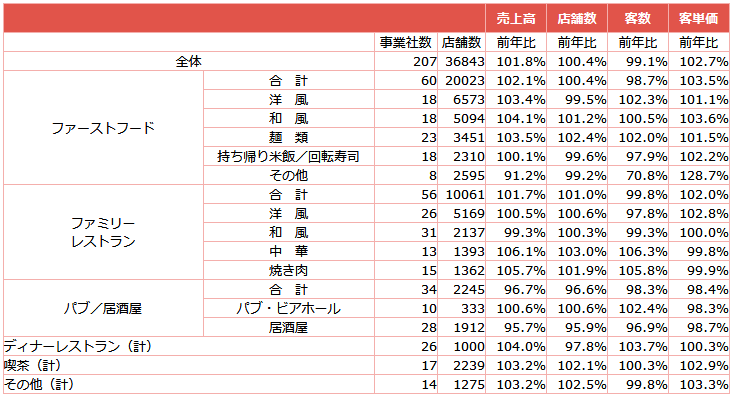 4月外食産業統計|価格改定効果で客単価アップし売上高1.8%増