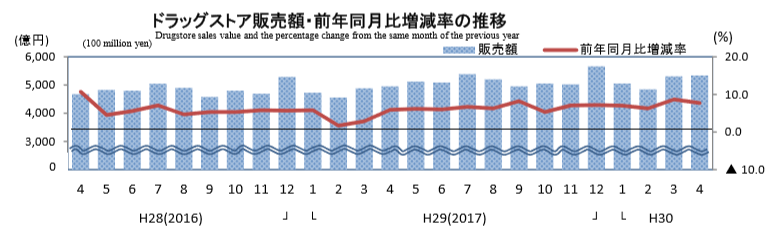 経済産業省発表「商業動態統計速報」の4月のドラッグストア販売額は5334億円で、前年同月を7.7%上回って好調だ。