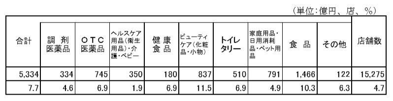 9カテゴリーの中で二桁の伸び率を示したのは「ビューティーケア用品」11.5%増と「食品」10.3%増。続いて「OCT医薬品」「健康食品」「トイレタリー」の3つが6.9%増。そして「その他」6.3%増、「家庭用品・日用消耗品・ペット用品」4.9%増。ドラッグストアの核商品の「調剤医薬品」は4.6%増、「ヘルスケア用品・介護・ベビー」1.9%増で、伸び率は低い。