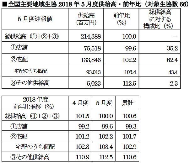 5月生協統計|売上げ2143億円横ばいも宅配2.2%増、個配3.4%増