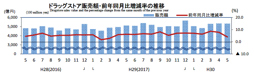 経済産業省発表「商業動態統計速報」の5月のドラッグストア販売額は5327億円で、前年同月を4.0%上回り、引き続き好調を維持している。