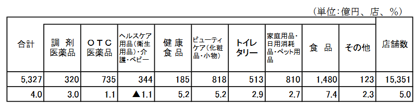「食品」が7.4%増で最も伸び率が高い。次いで「ビューティーケア用品」「健康食品」が5.2%増と好調だ。「調剤医薬品」3.0%増、「トイレタリー」2.9%増、「家庭用品・日用消耗品・ペット用品」2.7%増、「その他」2.3%増、「CTO医薬品」1.1%と続く。