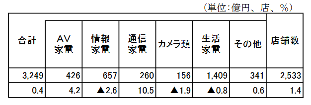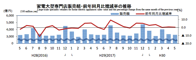 経済産業省発表の5月の「商業動態統計速報」では、家電大型専門店販売額は3249億円と0.4%増加した。店舗数は1.4%増え、2533店舗。