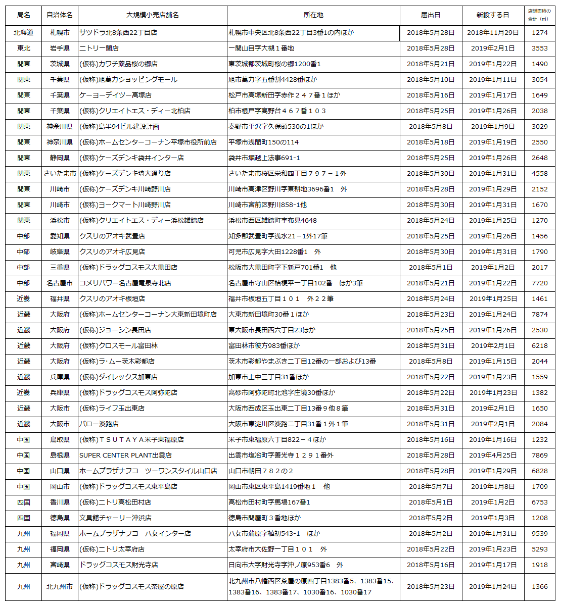 ⇒大規模小売店舗立地法(新設)届出の概要【2018年5月末】
