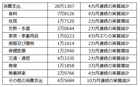 2人以上の世帯の消費支出は28万1307円。前年同月比実質は3.9%減で、4カ月連続で前年を下回った。