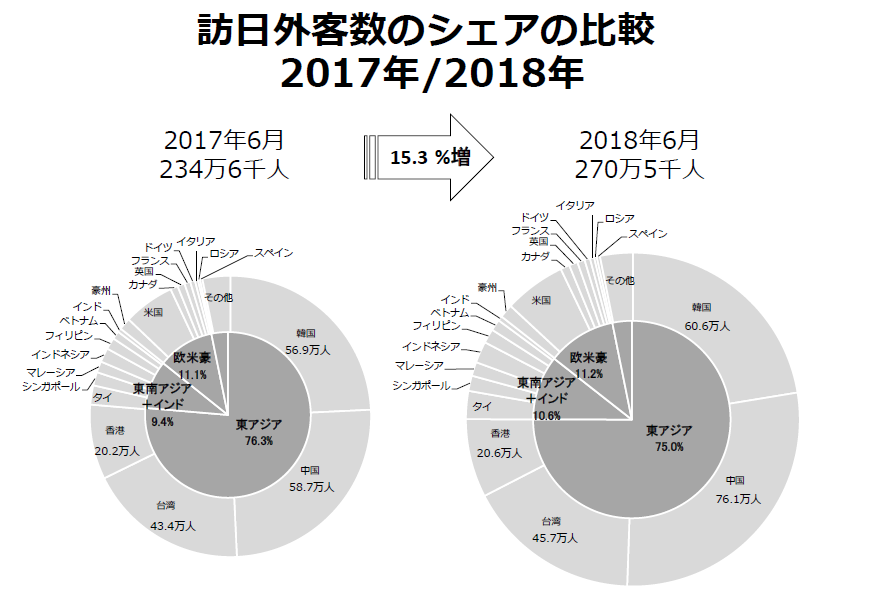 訪日外客数は270万5000人で前年同月比15.3%の増加だった。昨2017年6月の234万6000人を35万人以上も上回り、6月として過去最高を記録した。上半期の累計では、前年同月比15.6%増の1589万9000人となり、世界の20市場からの来訪者数すべてで過去最高となった。