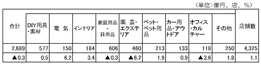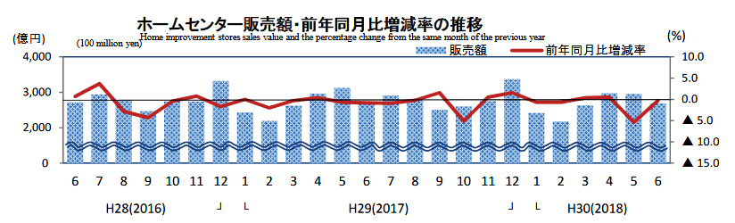 経済産業省発表の「商業動態統計速報」では、ホームセンターの6月販売額は2689億円で、前年を0.3%下回った。店舗数は1.1%増加し、4325店舗。