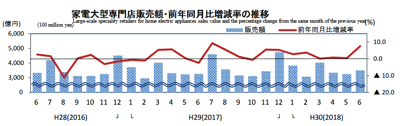 経済産業省発表の6月の「商業動態統計速報」では、家電大型専門店販売額は3504億円と7.6%増と大きく伸長した。店舗数は1.5%増え、2540店舗。