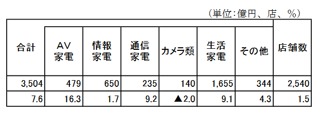 6月家電チェーン統計|販売額3504億円7.6%増/AV家電16.3%と二桁増