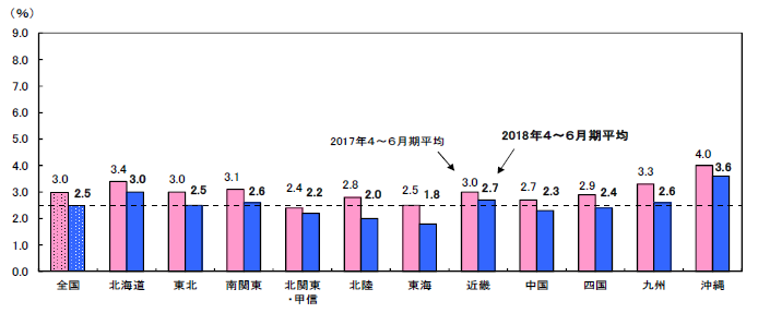 北海道3.0%(▲0.4ポイント) 、近畿2.7%(▲0.3)、東北2.5%(▲0.5) 、中国2.3%(▲0.4)、南関東2.6%(▲0.5) 、四国2.4%(▲0.5)、北関東・甲信2.2%(▲0.2) 、九州2.6%(▲0.7)、北陸2.0%(▲0.8)、沖縄3.6%(▲0.4)、東海1.8%(▲0.7)。