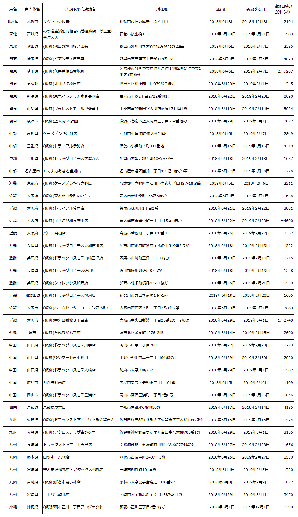 ⇒大規模小売店舗立地法(新設)届出の概要【2018年6月末】