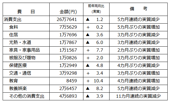 2人以上の世帯の消費支出は26万7641円。前年同月比実質は1.2%減で、5カ月連続で前年を下回った。