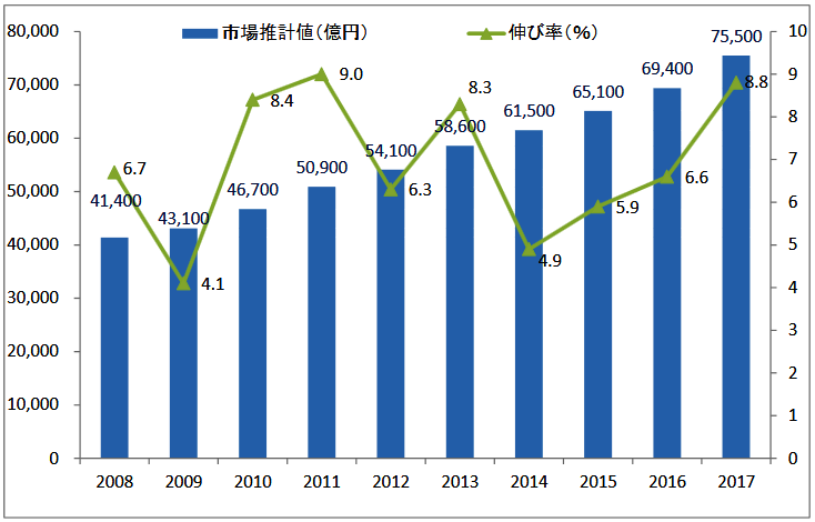 2017年度の売上高は、前年に比べ6100億円増して8.8%増の7兆5500億円。マイナス成長を記録した1998年度以降、19年連続で伸長している。直近10年の平均成長率は6.9%と順調な伸び率だ。