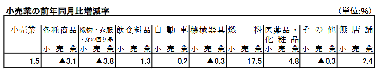 小売業の販売額は12兆4140億円の1.5%増。季節調整済みでは0.1%増。商品別に見ると、燃料小売業17.5%など5業種が増収。前年を下回ったのは、織物・衣服・身の回り品など4業種。