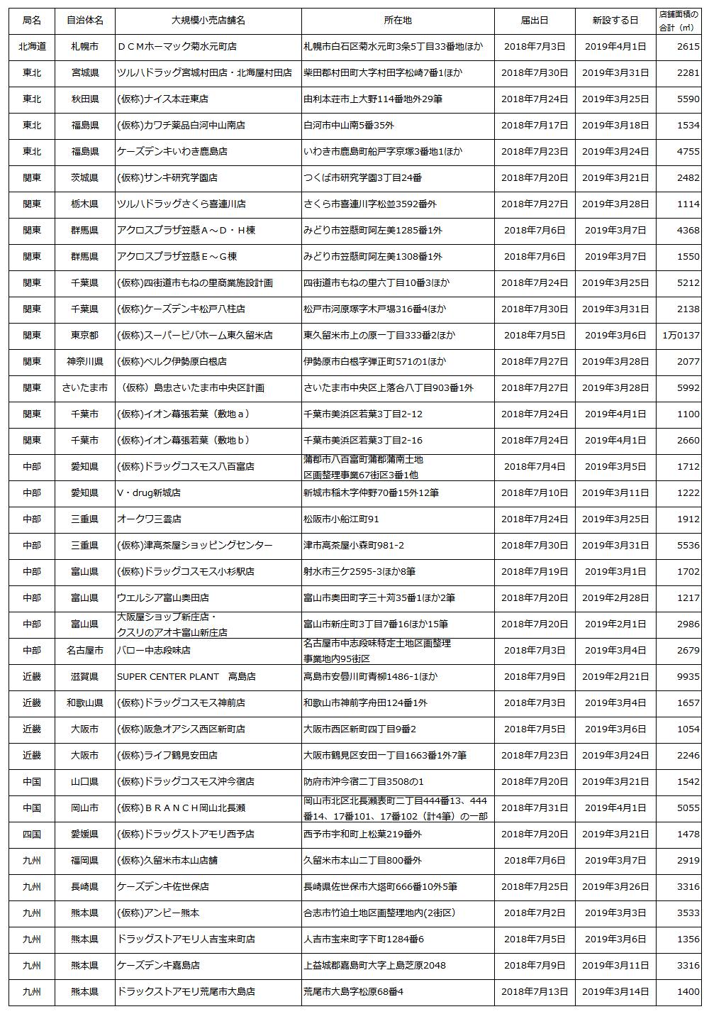 ⇒大規模小売店舗立地法(新設)届出の概要【2018年7月末】