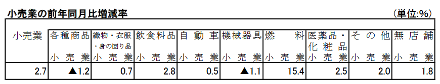 小売業の販売額は11兆8120億円の2.7%増。季節調整済みでは0.9%増。商品別に見ると、燃料小売業15.4%増など7業種が増収。前年を下回ったのは、各種商品と機械器具。