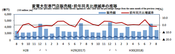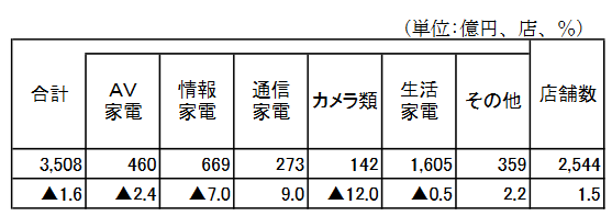 経済産業省発表の8月の「商業動態統計速報」では、家電大型専門店販売額は3508億円で1.6%前年を下回った。店舗数は1.5%増え、2544店舗。
