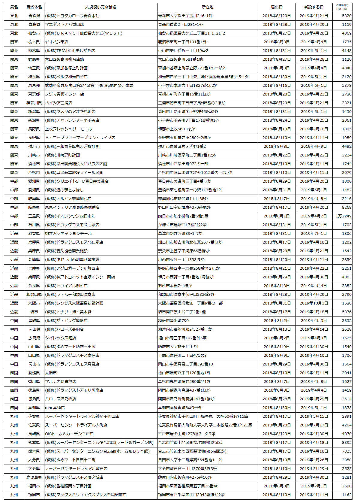 ⇒大規模小売店舗立地法(新設)届出の概要【2018年8月末】