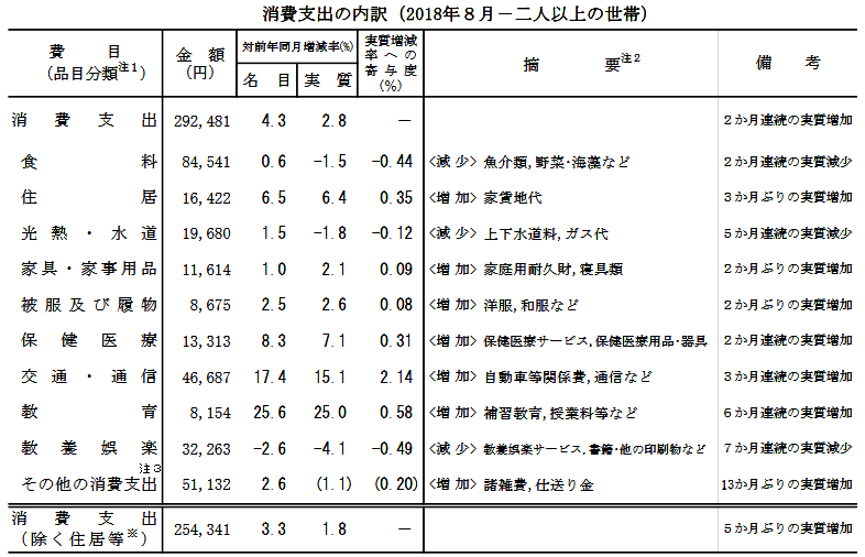 8月の消費支出で増加したのは、「住居」「家具・家事用品」「被服及び履物」「保健医療」「交通・通信」「教育」の6項目。とくに「教育」は、補習教育や授業料などに費用がかかり、前年より25%増加した。また、「交通・通信」も15.1%と大きく消費量が増えた。自動車関係費や通信などが増加項目。夏休みシーズンで旅費が増えたと思われる。