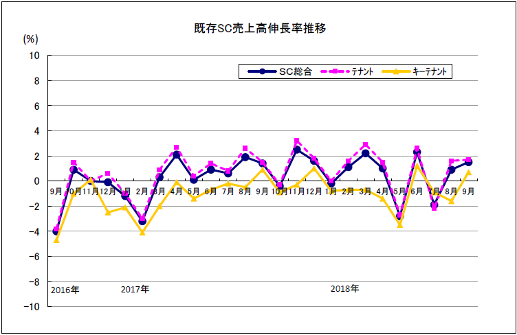 9月は、2つの台風の上陸、震度7を記録した北海道胆振東部地震と自然災害が相次いだため、臨時休業したSCもあり、一部の地域では苦戦が見られた。しかし、昨年よりも休日が2日多く、3連休が2回あったこともあり、全体としては前年同月を上回った。