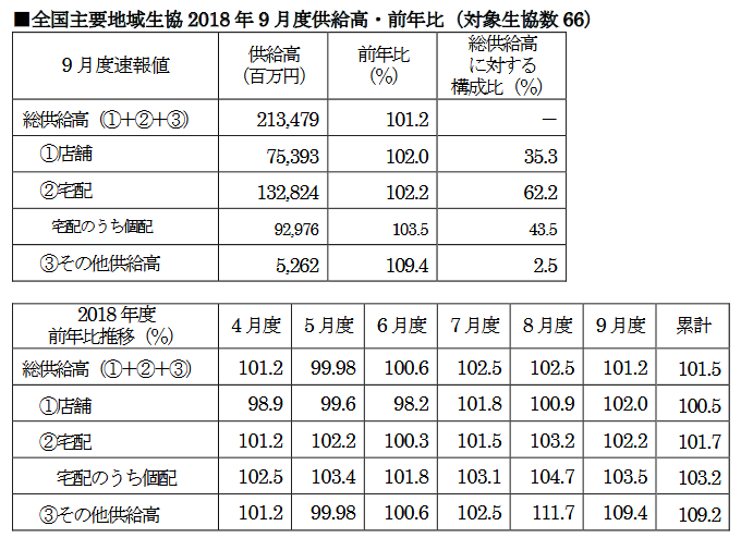 9月生協統計|供給高1.2%増/宅配1328億円2.2%増/個配3.5%増