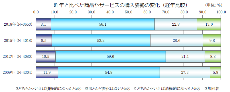 「どちらかといえば消極的になったと思う」は、消費増税後の2015年調査と比較して5.8 ポイント減少したものの、2012年よりも多くなっている。