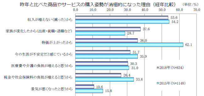 消極的になった理由では、消費増税後の2015年の調査で「物価が上がったから」が最も多かったのに対して、今回は「収入が増えない(減った)から」の53.6%が最も多い結果となった。