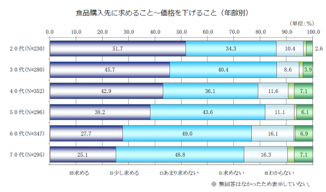 世代ごとに差が見られたのは「価格を下げること」で、「価格を下げること」に対して「求める」と回答した割合は20代では51.7%に上った一方、50代では38.2%にとどまるなど、若い世代の方が強く求める傾向となった。
