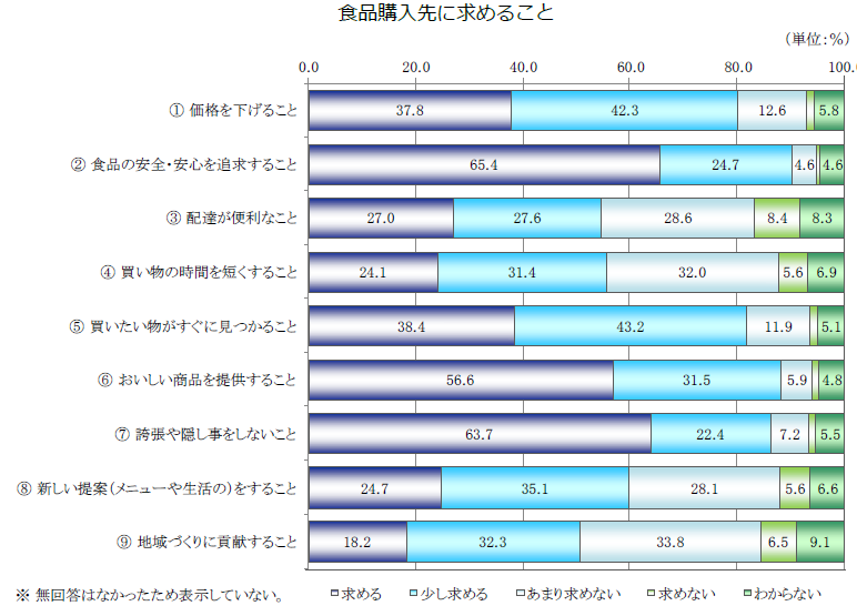 ⑷一般消費者に対して食品購入先に求めることを質問したところ、「求める」「少し求める」と回答した割合が多かった順に「安全・安心」(90.1%)、「おいしい商品」(88.1%)、「誇張や隠し事をしない」(86.1%)となった。