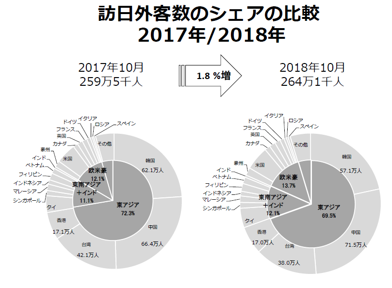 訪日外客数は264万1000人で前年同月比1.8%の増加だった。昨2017年10月の259万5000人を4万人以上も上回り、10月として過去最高を記録した。