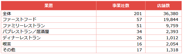 フードサービスを業態別に集計し、新店を含めた全店を対象に調査する。10月末時点で、調査対象企業数は9月に比べて2社増えて201社。店舗数は3万6380店舗で、1カ月で222店舗減少した。