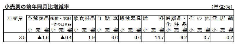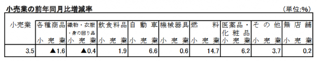 小売業の販売額は11兆9280億円で3.5%増。季節調整済みでは1.2%増。商品別に見ると、7業種が増収。前年を下回ったのは、織物・衣服・身の回り品小売業と各種商品小売業の2業種だった。
