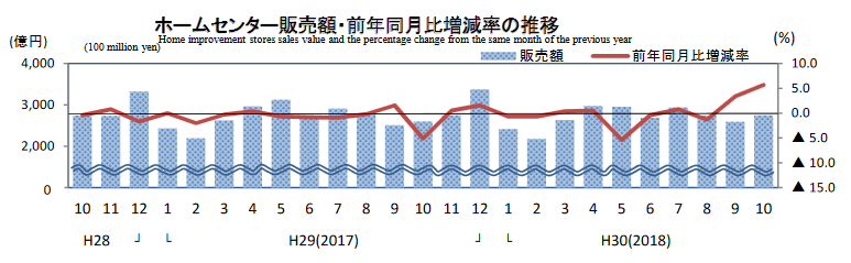 経済産業省発表の「商業動態統計速報」のホームセンター10月の販売額は2746億円で、5.7%前年を上回った。店舗数は0.9%増加して、4332店舗。