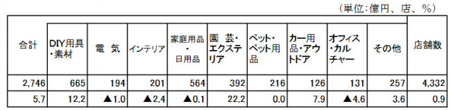 カテゴリー別では「園芸・エクステリア」が22.2%と大きく伸長した。「DIY用具・素材」も12.2%と二桁増。そして「カー用品・アウトドア」7.9%増と続く。