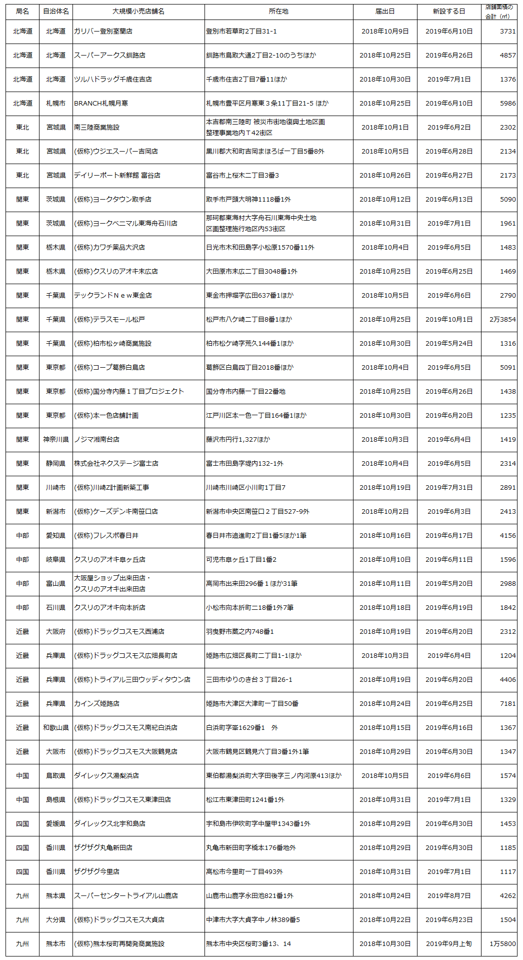 10月大店立地法届出|核店舗サミットストアの「テラスモール松戸」ほか39件