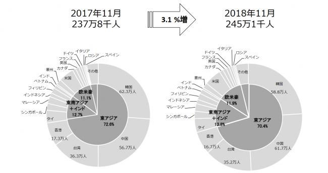 2018年11月の訪日外客数は、前年同月比3.1%増の245万1000人。2017年11月の237万8000人を約7万人上回り、毎月同じフレーズになるが、11月としては過去最高を記録した。