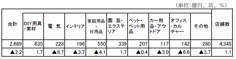 カテゴリー別では「DIY用具・素材」と「園芸・エクステリア」が1.7%増収した。一方で、「電気」▲8.7%、「オフィス・カルチャー」▲6.6%で、これらを含む7カテゴリーは前年に届かなかった。