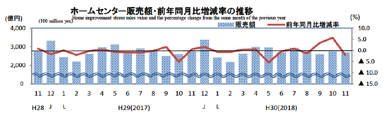 経済産業省発表の「商業動態統計速報」のホームセンター11月の販売額は2689億円で、前年同月比2.2%減だった。店舗数は1.1%増加して、4345店舗。
