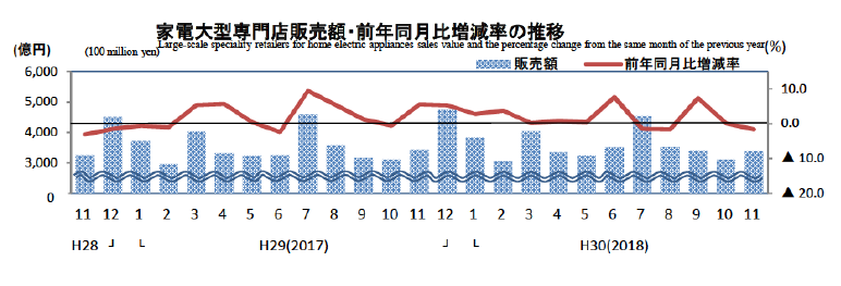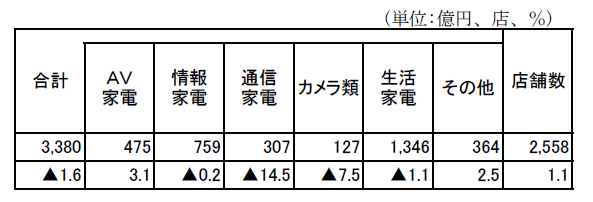 経済産業省発表の11月「商業動態統計速報」では、家電大型専門店販売額は3380億円で1.6%の減収だった。店舗数は1.1%増えて、2558店舗。