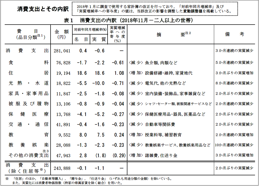 11月家計調査統計|消費支出0.6%減で3カ月連続/食料費5カ月連続減少
