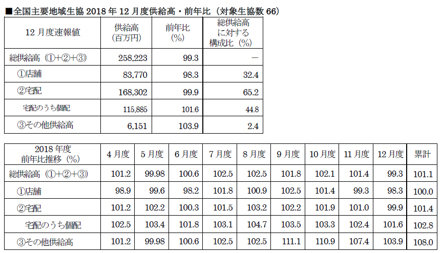 日本生活協同組合連合会(本田英一代表理事会長)が12月度の供給高(売上高)速報を発表した。全国66主要地域を集計している。