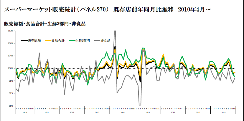 12月スーパーマーケット統計|12月既存店1.3%減/2018年度全体では横ばい
