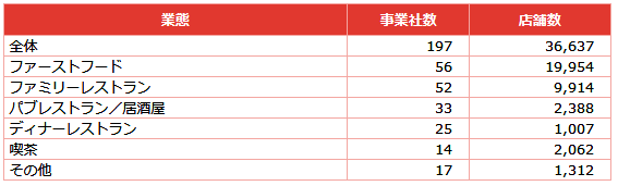 フードサービスを業態別に集計して、新店を含めた全店を対象に調査する。12月末時点で、調査対象企業数は11月に比べて5社減って197社。店舗数は3万6637店舗で1カ月で70店舗増加した。その中でファストフードとファミリーレストランを合わせると全体の8割を超える。