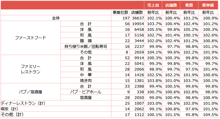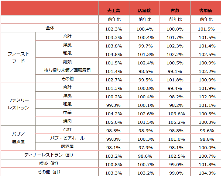 業態別では、ファストフード(FF)3.7%、ディナーレストラン3.0%が伸び率も高く好調だ。洋風ファストフードは、季節商品やクリスマスのチキンの売上げが伸長して5.5%増だった。パブ・ビアホール0.7%、ファミリーレストラン0.3%も前年を上回った。