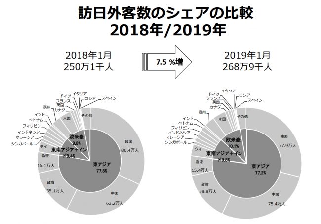 日本政府観光局(JNTO)が、2019年1月の訪日外客数を発表した。