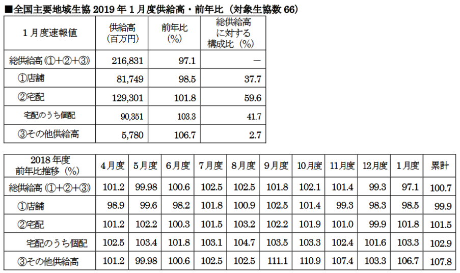 1月日生協統計|供給高2.9%減/店舗1.5%減・宅配1.8%増・個配3.3%増