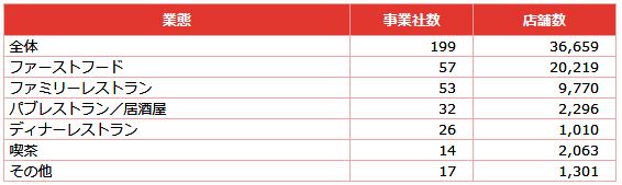 フードサービスを業態別に調査し新店を含めた全店を対象に調査する。1月末時点で、調査対象企業数は199社。店舗数は3万6659店舗。その中でファストフードは2万0219店舗。全体の55%を占める。