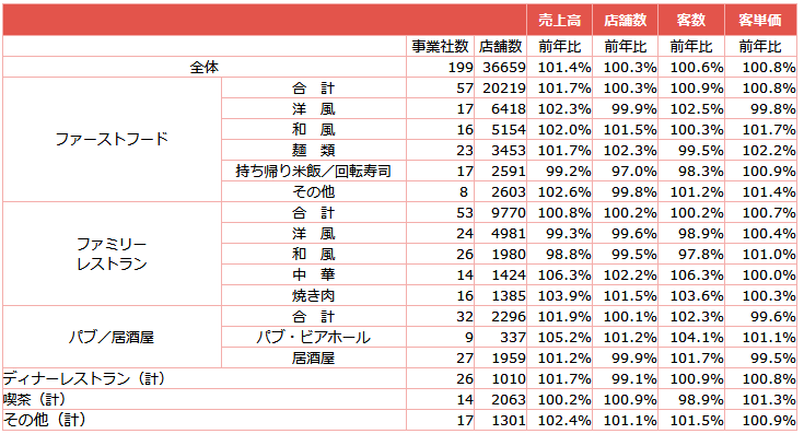 また、ファミリーレストランの中華は年始キャンペーン効果で6.3%増。焼肉は客数が堅調に伸びて、26カ月連続で前年を上回った。