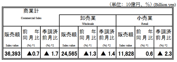 卸売業と小売業を合わせた商業販売額は36兆3930億円で、前年を0.7%下回った。季節調整済みでは1.7%減。