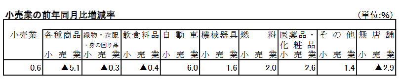 小売業の販売額は11兆8280億円で0.6%増。季節調整済みでは2.3%減だ。自動車小売業6.0%をはじめ5業種が増収した。一方、各種商品小売業(百貨店など)▲5.1%など4業種は前年を下回った。